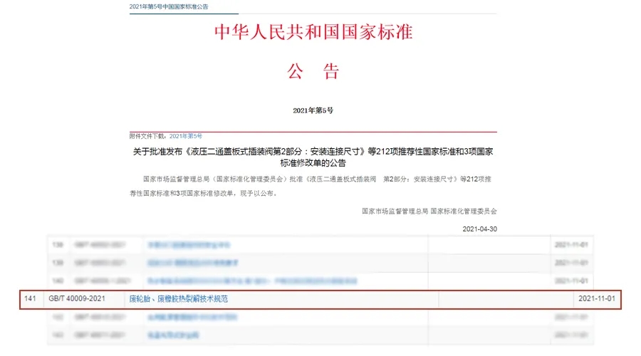 2021年4月30日,國家市場監(jiān)督管理總局、國家標準化管理委員會發(fā)布2021年第5號中國國家標準公告,批準了《廢輪胎、廢橡膠熱裂解技術規(guī)范》等國家標準。