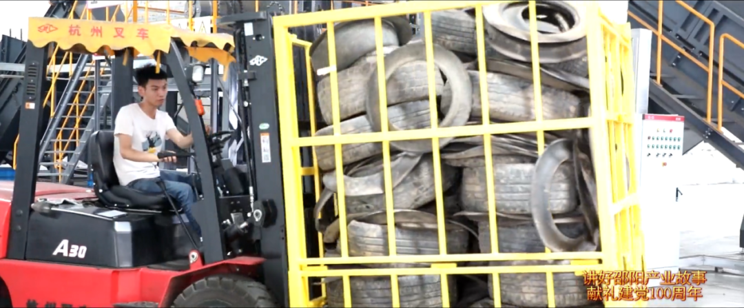 “一輛輛小車滿載著廢舊輪胎進入廠區(qū),卸下的廢舊輪胎隨即被運送到上料區(qū),經過智能切割和清洗后再運送到智能裂解裝備中”;