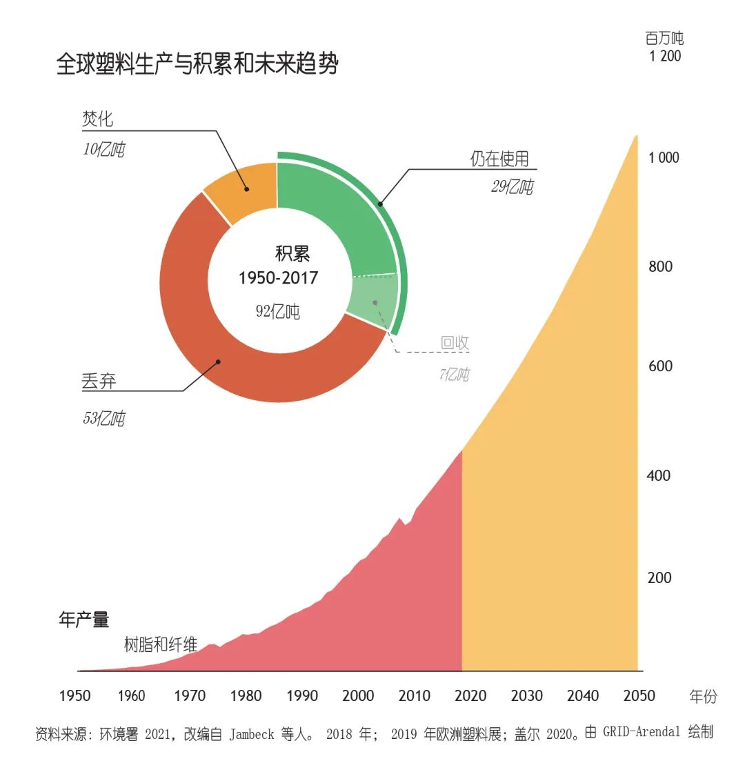 1950-2017期間全球累積產(chǎn)生92億噸廢塑料;其中,其中大約70億噸都成為了塑料垃圾。這些塑料垃圾的回收率很低,不到10%。數(shù)以百萬噸計的塑料垃圾被丟棄到自然環(huán)境中,或是被運到數(shù)千公里之外焚燒或傾倒。