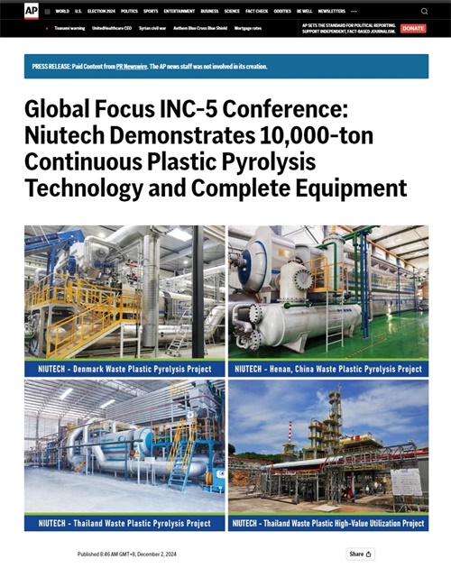 第五屆政府間塑料污染談判委員會(INC-5)在INC-5會議期間,美國最大的通訊社,將關(guān)注重點從會場內(nèi)轉(zhuǎn)向會場外,,并以“Niutech Demonstrates 10,000-ton Continuous Plastic Pyrolysis Technology and Complete Equipment”為題,報道了恒譽(yù)環(huán)保在丹麥、泰國、韓國及中國本土,持續(xù)穩(wěn)定運行數(shù)年的多個。“全球廢塑料污染治理,離不開先進(jìn)技術(shù)的支撐,其中來自中國的恒譽(yù)環(huán)保,,安全環(huán)保地將廢塑料變?yōu)樵偕Y源產(chǎn)品,減少了環(huán)境污染的同時,為經(jīng)濟(jì)綠色發(fā)展做出貢獻(xiàn),為全球廢塑料污染治理提供了示范案例。