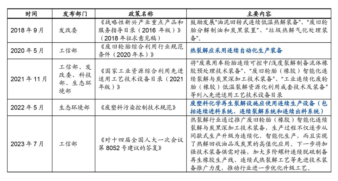 熱解技術(shù)主要是利用有機(jī)廢棄物熱不穩(wěn)定性,在無氧環(huán)境中通過精準(zhǔn)的控溫加熱,讓大分子轉(zhuǎn)化為小分子的液態(tài)油、可燃?xì)狻⒐腆w產(chǎn)品等高附加值產(chǎn)物。其中代表行業(yè)創(chuàng)新與技術(shù)實(shí)力最高水平的“連續(xù)式熱解工藝”,憑借廣泛的物料適應(yīng)性、充分的資源化能力及在節(jié)能降碳方面的潛力,備受廣大專家、學(xué)者的認(rèn)可,被譽(yù)為下一代的廢物處置“重大關(guān)鍵共性”技術(shù)②,入選國家產(chǎn)業(yè)鼓勵類發(fā)展目錄,代表了未來熱解主流技術(shù)方向。