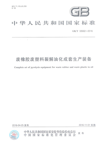 2016年11月1日,公司為第一起草單位的國(guó)家標(biāo)準(zhǔn)《廢橡膠廢塑料裂解油化成套生產(chǎn)裝備》標(biāo)準(zhǔn)號(hào):GB/T 32662-2016,正式頒布實(shí)施