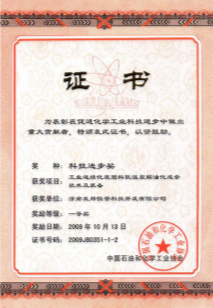 2009年10月13日,公司《工業(yè)連續(xù)化廢塑料低溫裂解油化成套技術及裝備》項目榮獲中國石油和化學工業(yè)協(xié)會科技進步獎